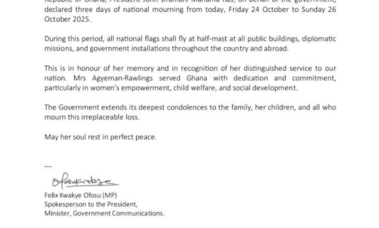 The Government of Ghana has declared three days of national mourning following the passing of former First Lady, Nana Konadu Agyeman-Rawlings. President John Dramani Mahama announced the decision on Friday, stating that the period of mourning will run from Friday, October 24, to Sunday, October 26, 2025.