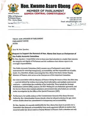 The Member of Parliament for Gomoa Central, Kwame Asare Obeng, popularly know as APlus has written to the Speaker of Parliament asking that the Member of Parliament for Atiwa East, Abena Osei Asare should be removed as chairperson of the Public Accounts Select Committee of Parliament (PAC).